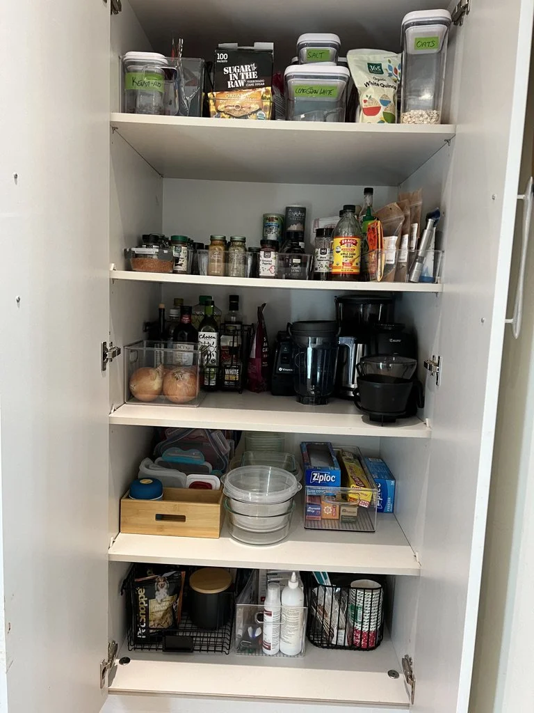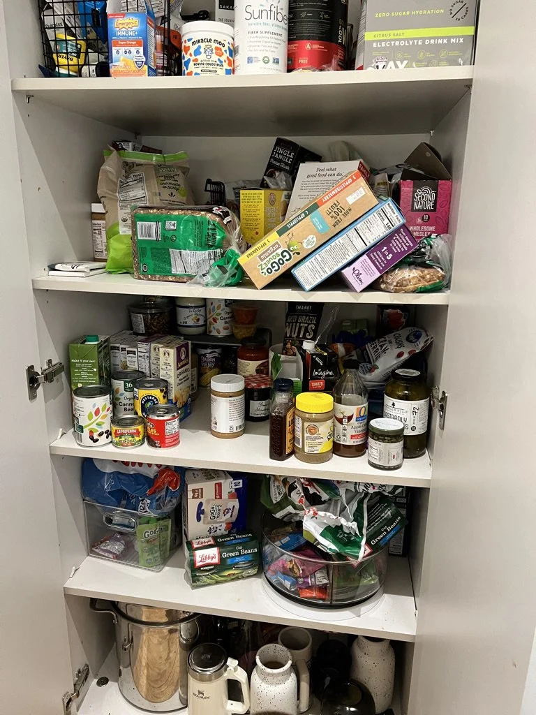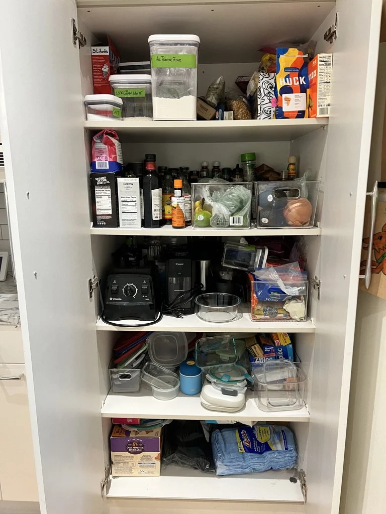Below, in a different pantry, Tupperware lids are buried by Ziploc bags and old lunchboxes.